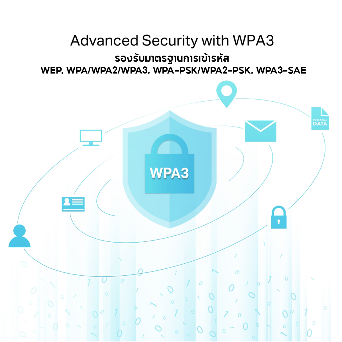 🎫 Advanced Security – รองรับมาตรฐานการเข้ารหัส WEP, WPA/WPA2/WPA3, WPA-PSK/WPA2-PSK, WPA3-SAE