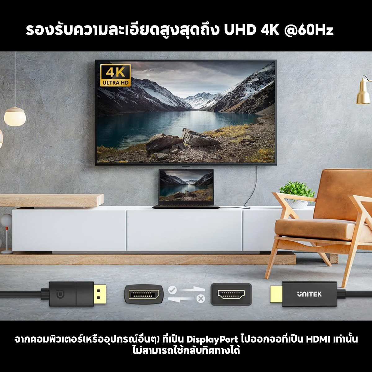 - Unidirectional Cable - DisplayPort to HDMI is NOT bi-directional. It only connects to a display with HDMI.