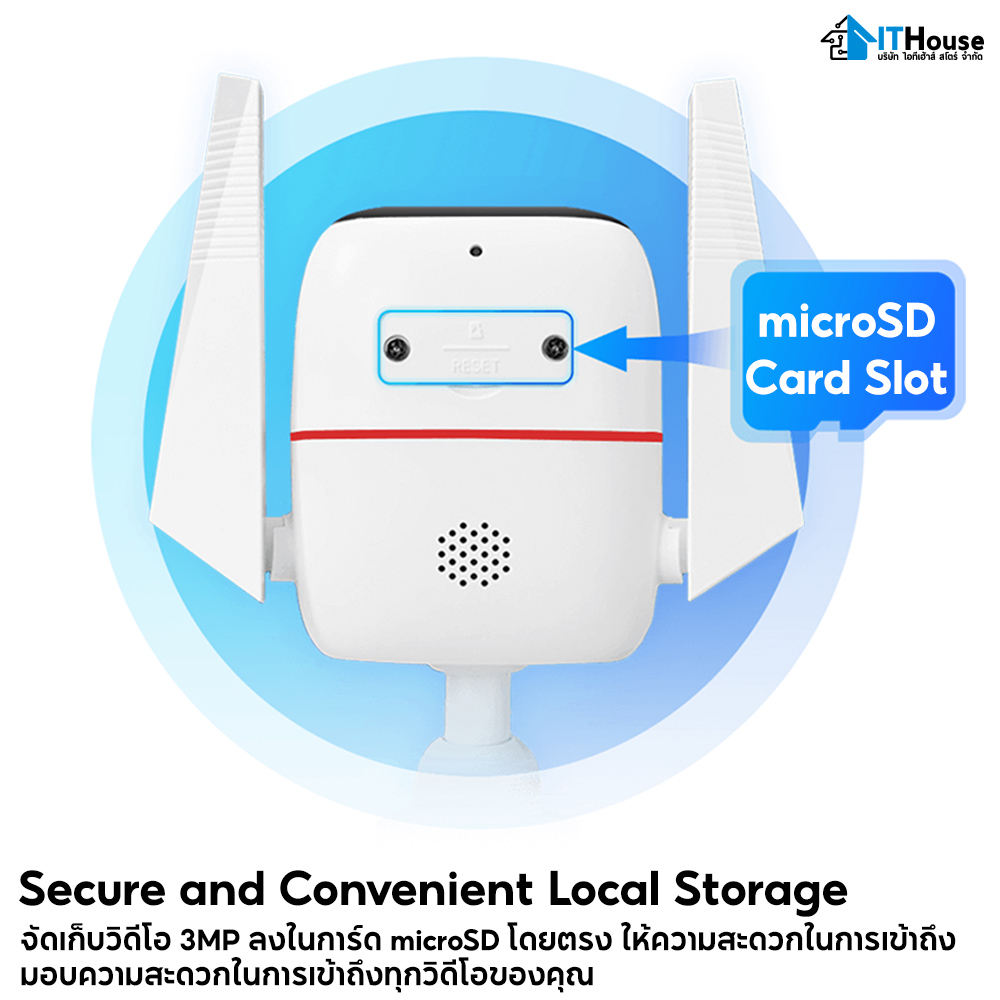 - Safe Storage : บันทึกวิดีโอและภาพด้วยความละเอียดคมชัด 3 ล้านพิกเซลลง micro SD Card ได้สูงสุดถึง 128GB