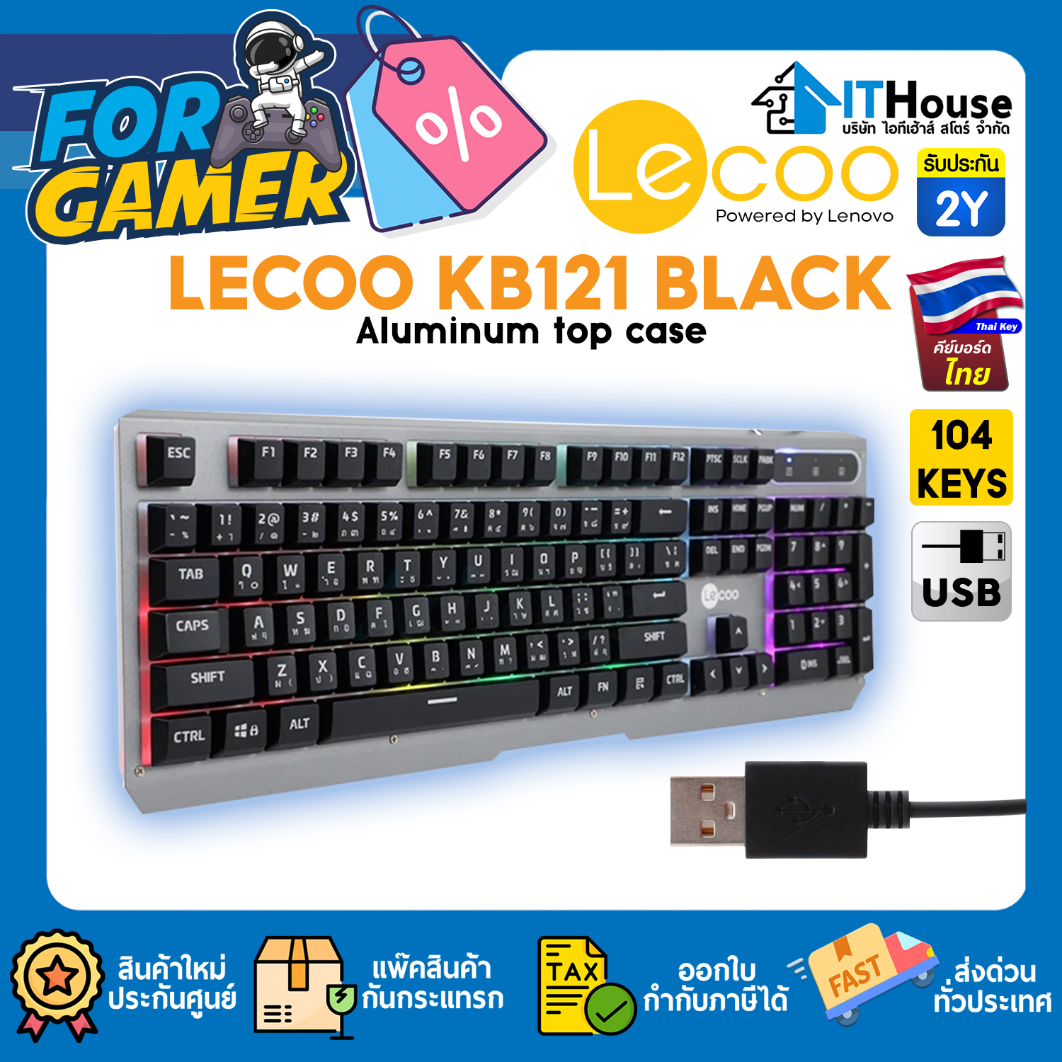 LENOVO LECOO KB121 คีย์บอร์ดเกมส์มิ่งบอดี้โลหะไฟ LED black light ปรับความสว่างได้รองรับการกด 10 ล้านครั้ง