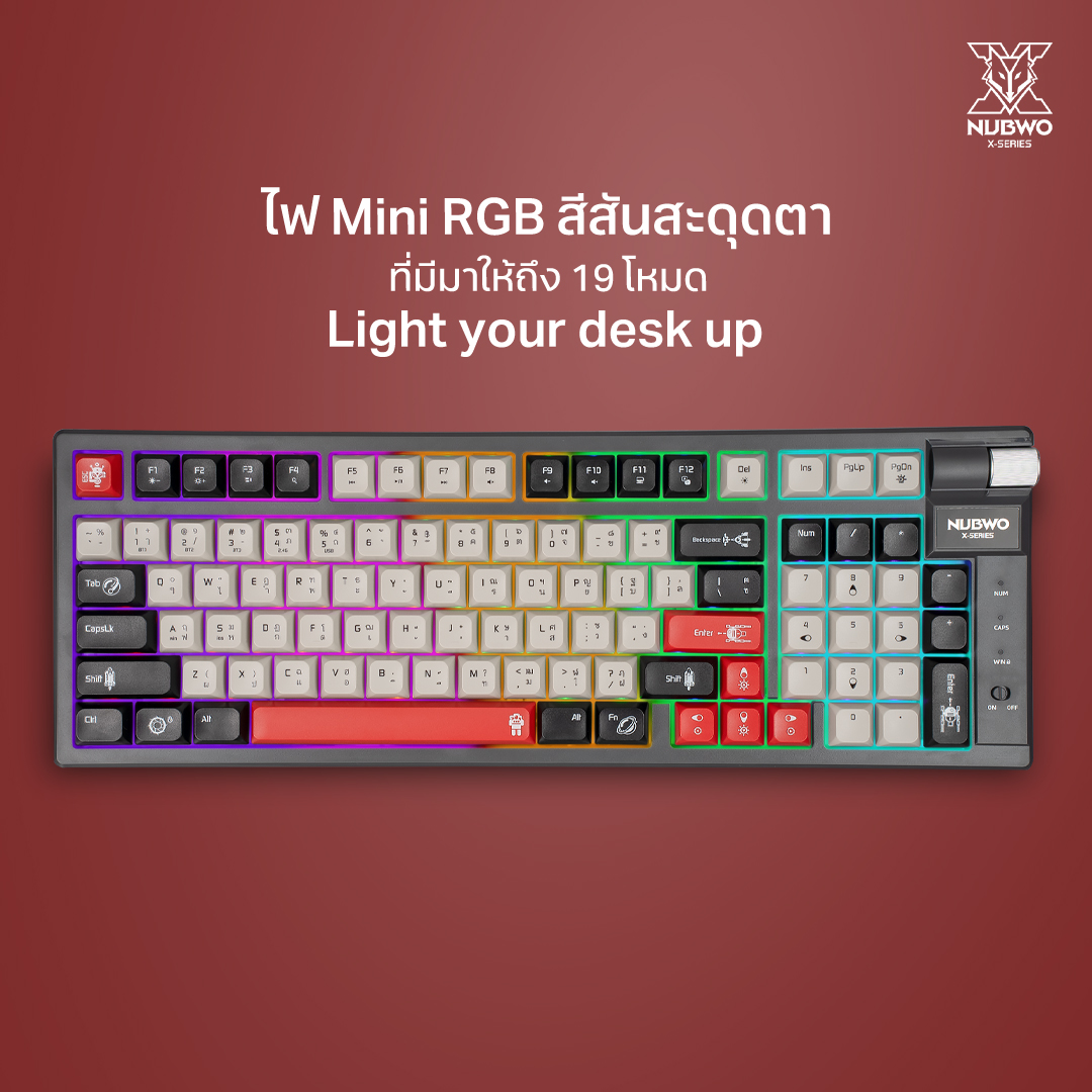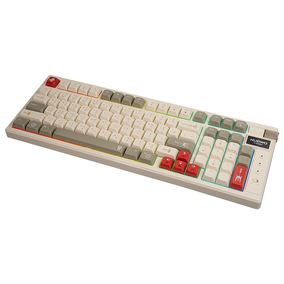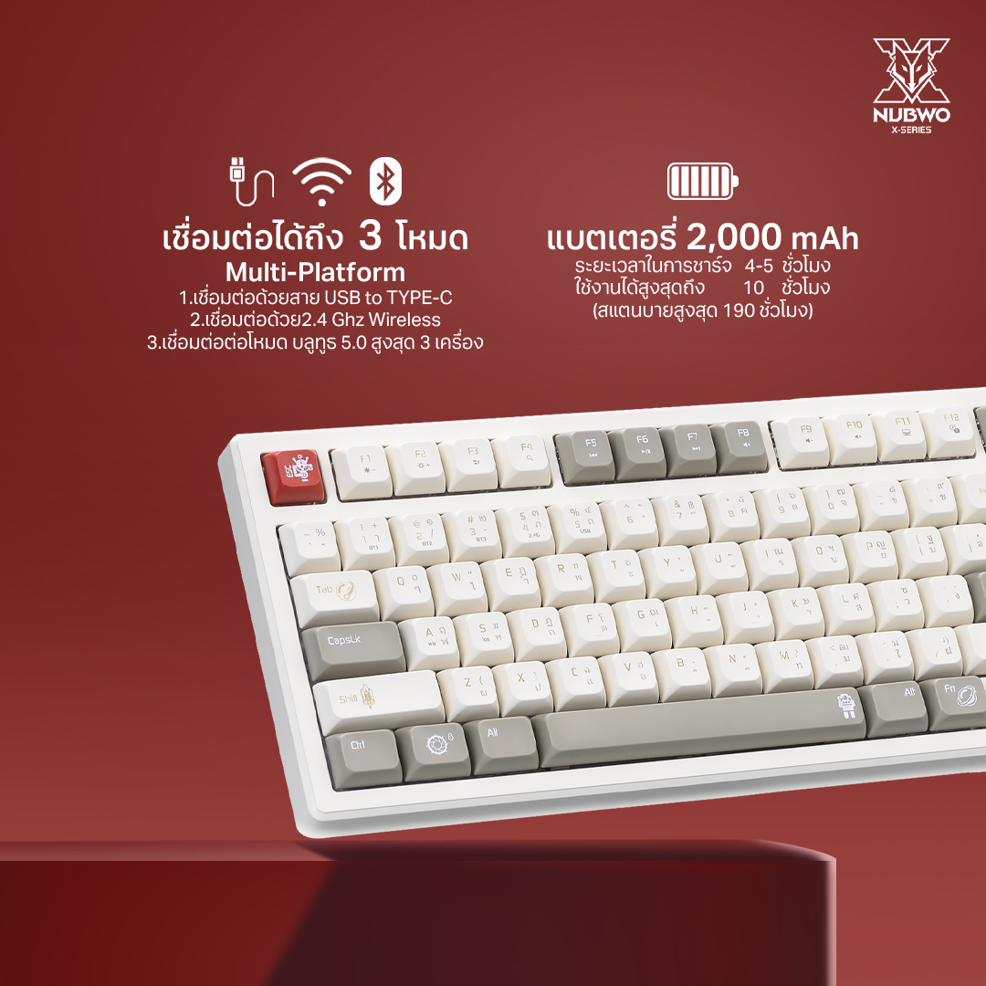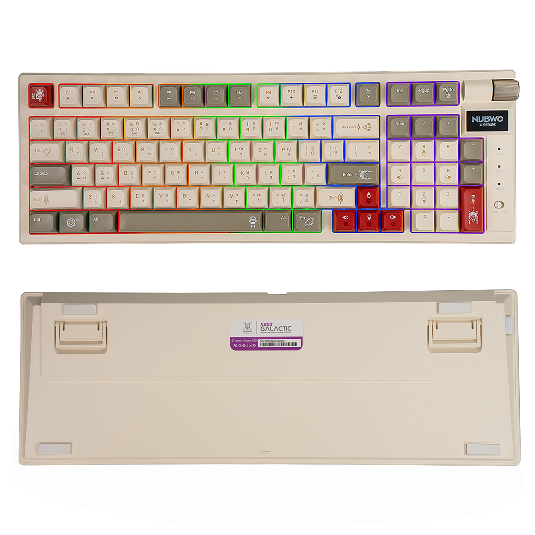 คีย์บอร์ดเกมมิ่ง รุ่น X803 ไฟแบบ Mini RGB มีสองสีให้เลือก Color Grey-Black / Cream-Brown ขนาด 98% มีปุ่มทั้งหมด 97 ปุ่ม ไร้สายเชื่อมต่อได้ 3 โหมด ด้วย Wireless 2.4G / Bluetooth 5.0 / USB รองรับการกด 50 ล้านครั้ง ความจุแบตเตอรี่ขนาด 2000 mAh🌈💥