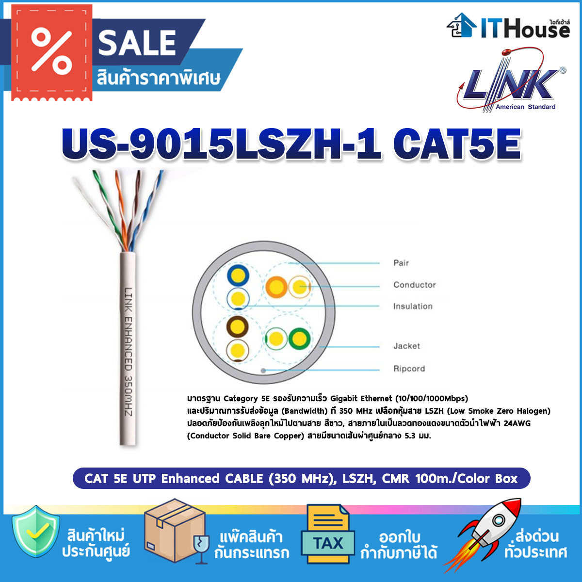 LINK CAT5e (US-9015LSZH-1) 100 เมตรสายแลนใช้เดินภายใน เปลือกหุ้ม LSZH สีขาว ไม่ติดไฟลวดทองแดงขนาดตัวนำไฟฟ้า 24AWG