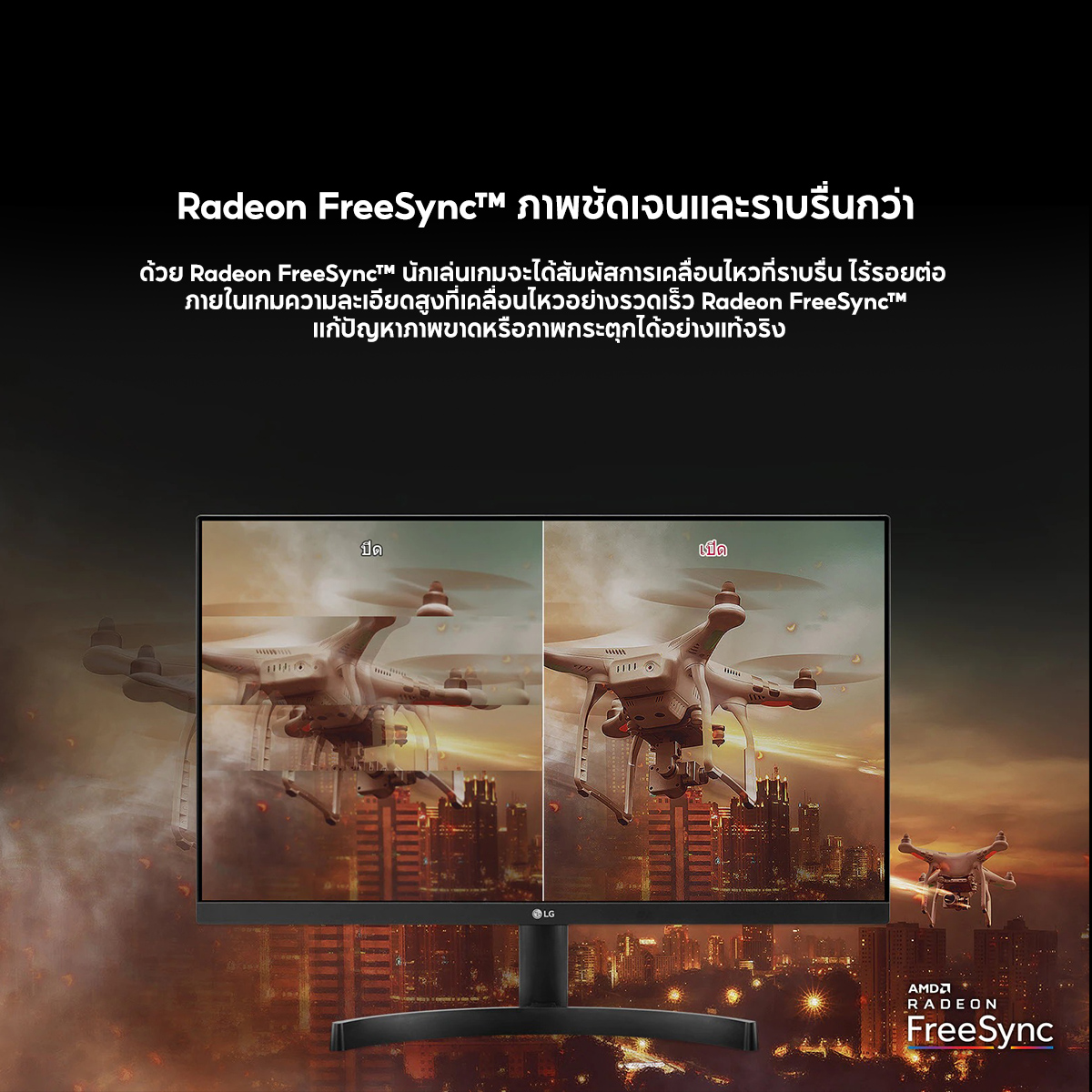 เทคโนโลยี AMD FreeSync™ นักเล่นเกมจะได้สัมผัสการเคลื่อนไหวที่ราบรื่น ไร้รอยต่อ ภายในเกมความละเอียดสูงที่เคลื่อนไหวอย่างรวดเร็ว ช่วยขจัดปัญหาภาพขาดหรือภาพกระตุกได้อย่างแท้จริง