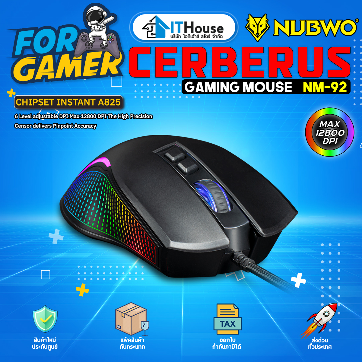 NUBWO CERBERUS NM-92M เมาส์เกมมิ่ง ไฟ RGB มี MACRO ปรับ DPI ได้ 6 ระดับ Max.12800 DPI